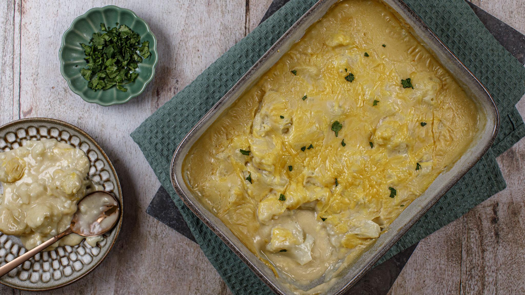 An indulgent and comforting dish. Have as a side dish along with a vegan roast and use your favourite vegan cheese to top. If you want to make a larger quantity, you can. Just double the cauliflower and the sauce ingredients, cook in batches and use two baking dishes. You could also swap the cheese on top for some crunchy, herby breadcrumbs.