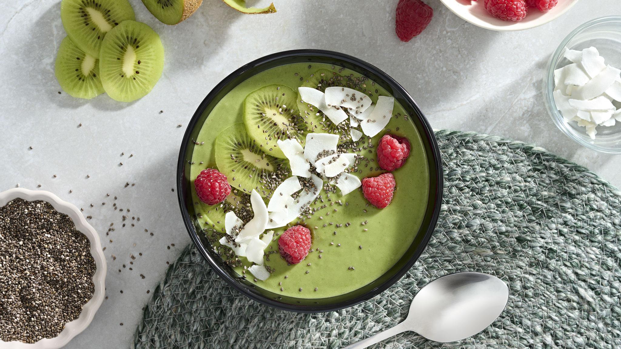 A refreshing tropical breakfast that's a great way to start the day. Top with your favourite toppings. We have used raspberries, kiwi, coconut, and chia seeds. Appliance: MultiPro OneTouch
