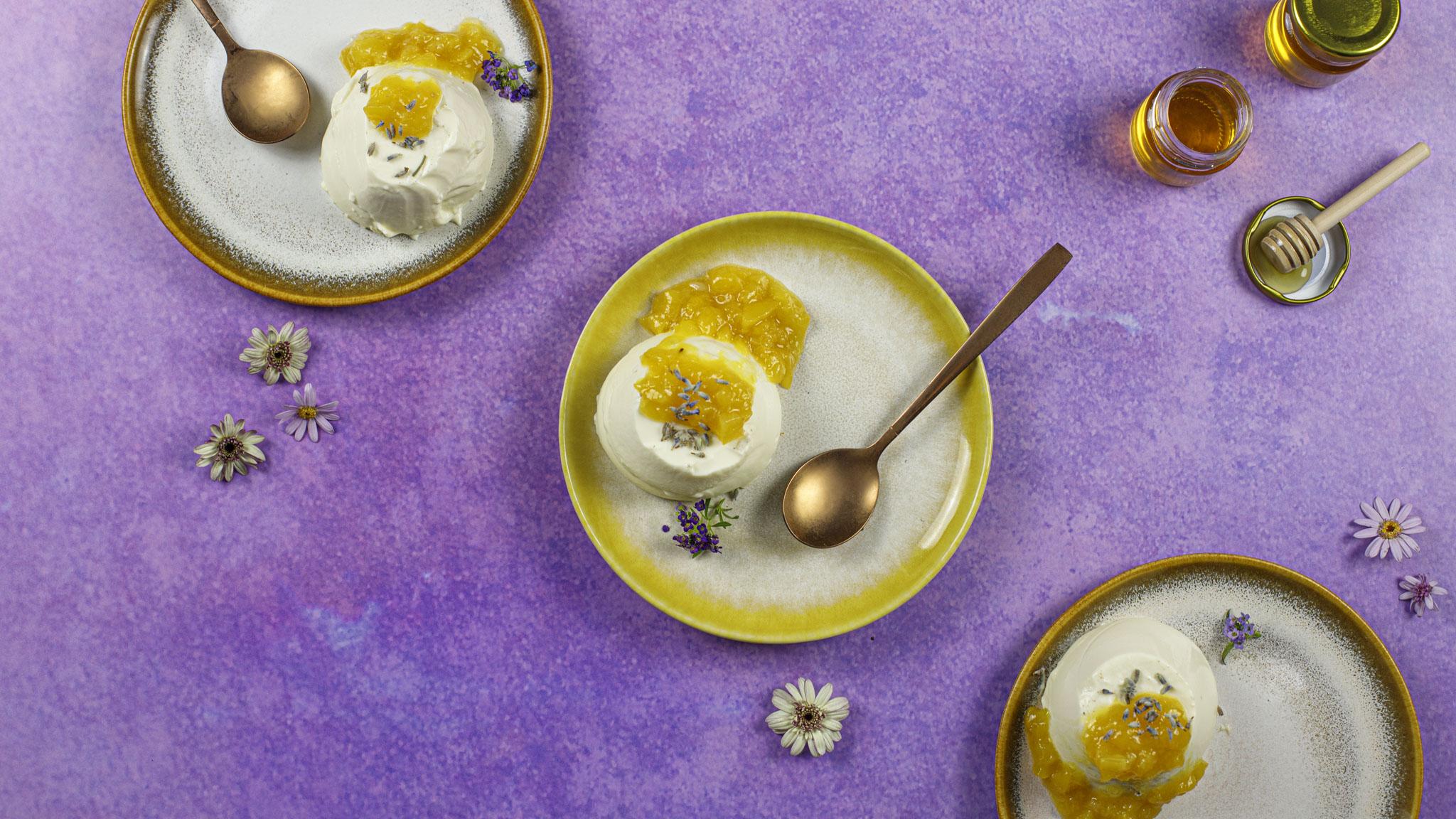 A sweet and creamy dessert served with a fruity compote. The type of honey with subtly change the flavour of the cakes and while normal runny honey is fantastic in these panna cottas, you could also use a lavender or wildflower honey.