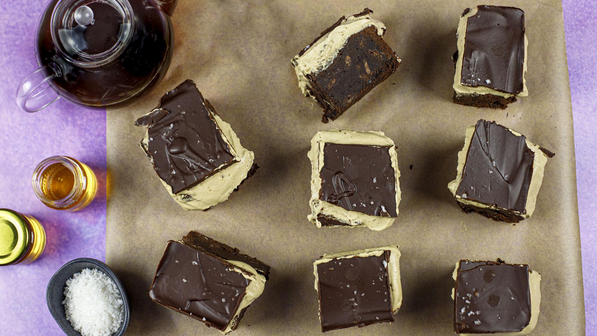 Decadent fudgy brownies, topped with whipped honey butterscotch cream and dark chocolate ganache, finished with a sprinkle of sea salt. These brownies take a while to make, so if you're short on time, make the brownies the day before, cool, then store unsliced and in the tin.