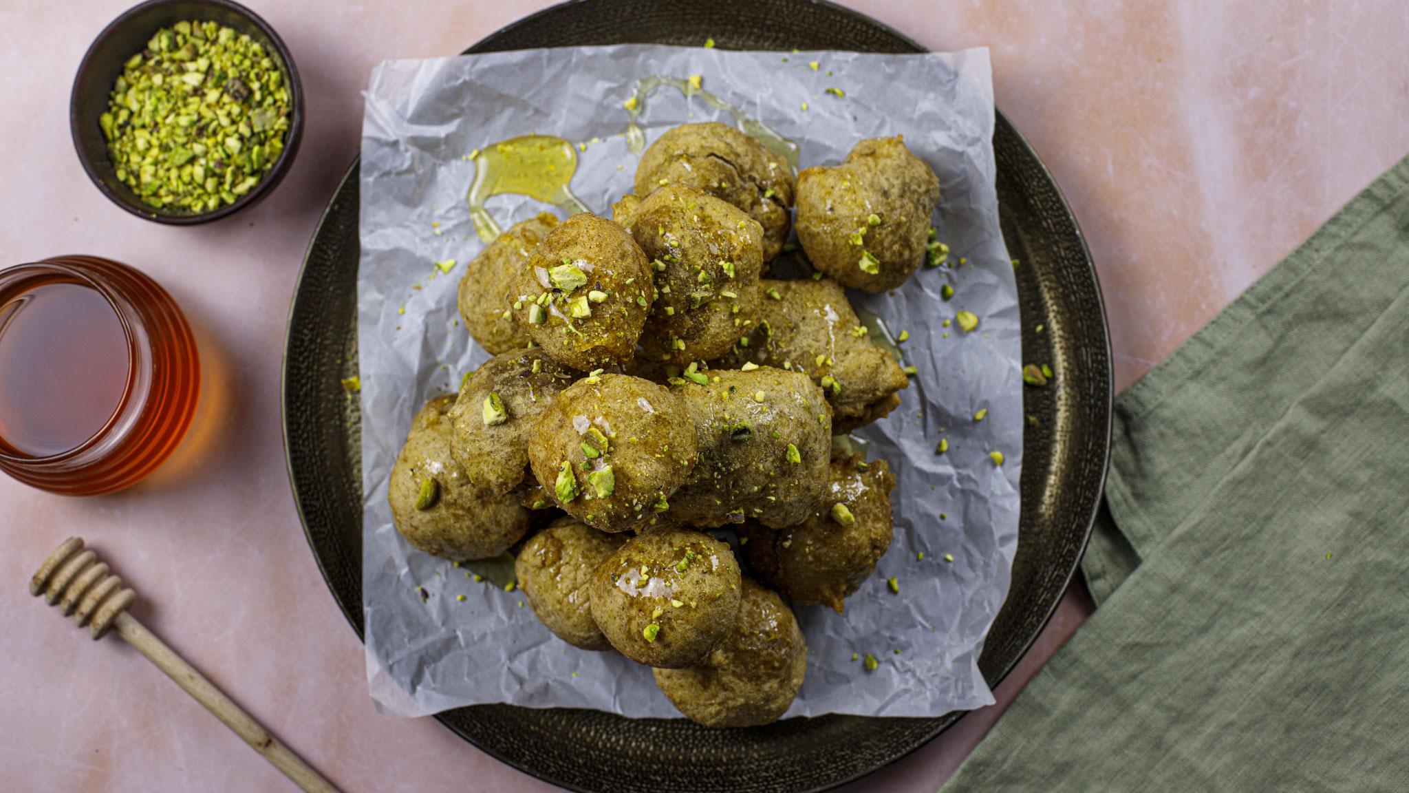 Fluffy, light on the inside and crispy on the outside, these bite sized doughnuts are perfect for sharing at your next gathering. They are flavoured with cinnamon and honey for a slight sweetness. We've finished ours with chopped pistachios, but you can swap for another nut or simply serve with honey.