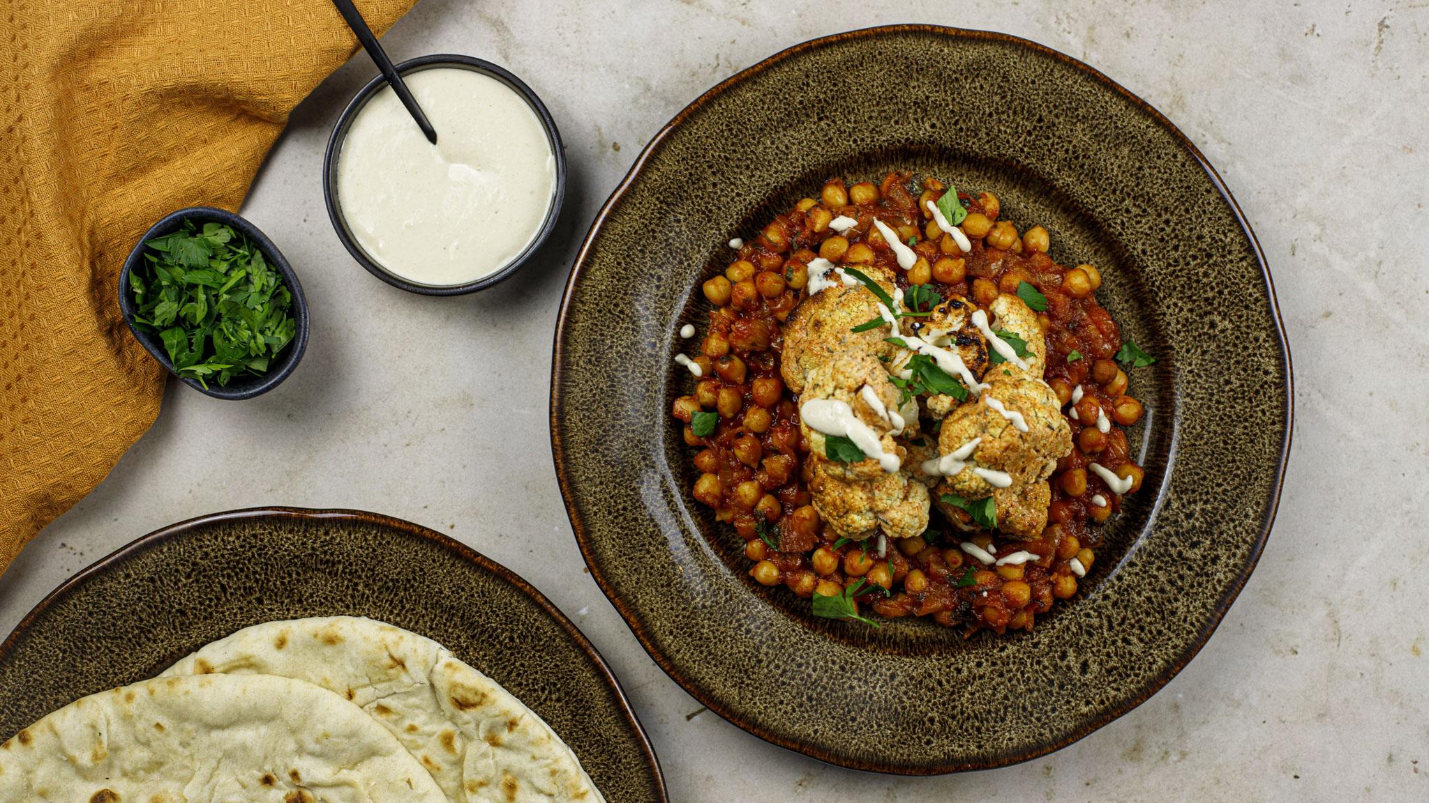 A delicious vegetarian dish of flavourful chickpeas topped with aromatic roasted cauliflower. You can swap the honey for hot honey for an extra kick.