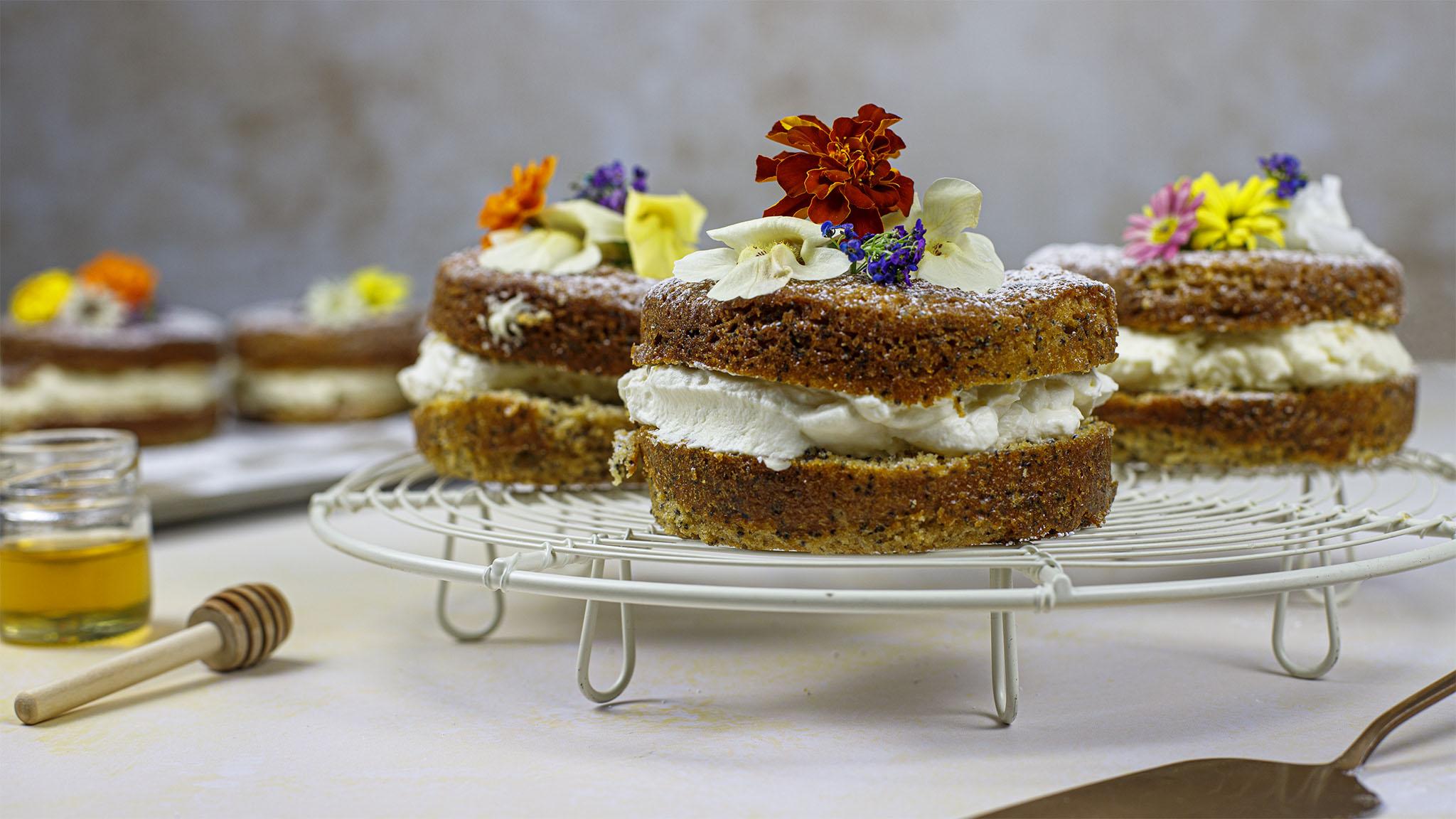 A classic honey cake. This recipe makes three 10cm (4-inch) cakes but can be scaled up to make six cakes. These are perfect for gifting, BBQ's, picnics, or parties. The type of honey with subtly change the flavour of the cakes and while any honey with make fantastic tasting cakes, we recommend using an orange blossom, wildflower, or herbal honey.