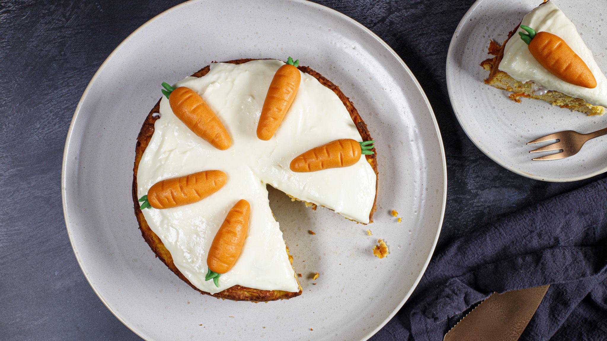 This carrot cake is completely gluten free. Made with ground almonds this carrot cake has a nutty flavour, topped with a cream cheese icing and marzipan carrots.