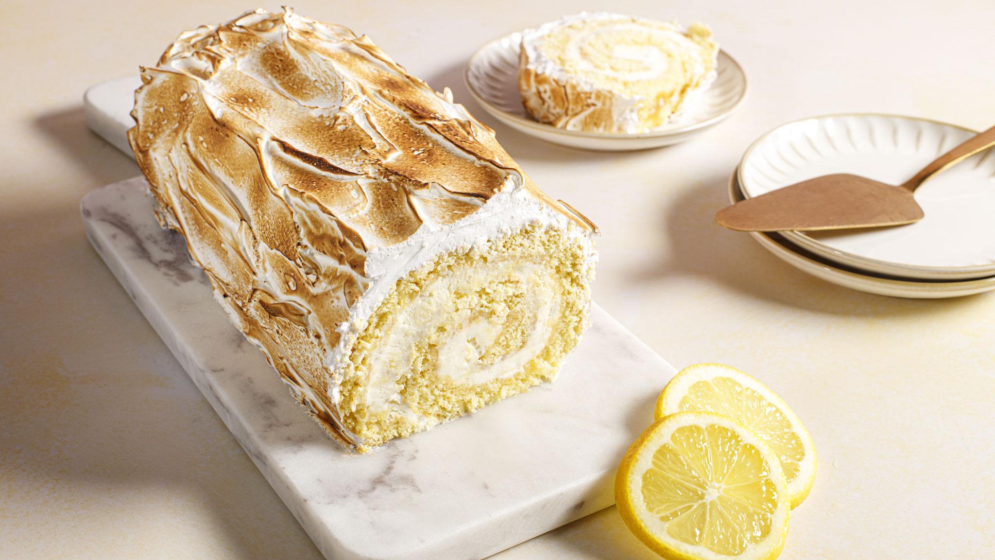 Lemon Meringue Swiss Roll, or cake roll, is made with a vanilla sponge cake, filled with lemon curd and whipped cream, and finished with swirls of torched Italian meringue. It makes a refreshing dessert for a summer treat. We recommend using pasteurised egg whites for the meringue and finishing it with a blowtorch, as a grill might be too hot for the filling.