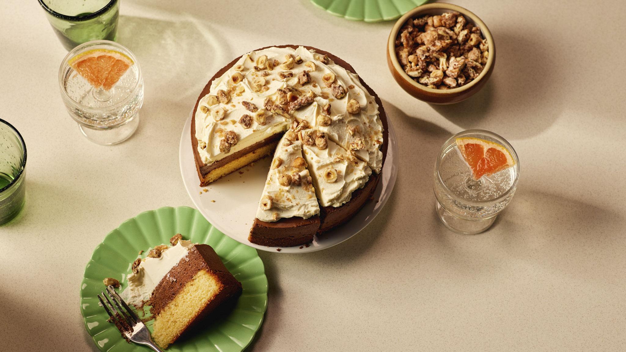 This modern take on the Torta Setteveil is inspired by the original but simplified to four layers, creating a classic dessert that is easier to make while still retaining its deliciousness. The base is a hazelnut sponge, layered with smooth dark chocolate mousse, finished with soft whipped mascarpone cream, and topped with crunchy frosted hazelnuts and pecans for added texture. To make this cake, you will need acetate sheets for lining the tin.