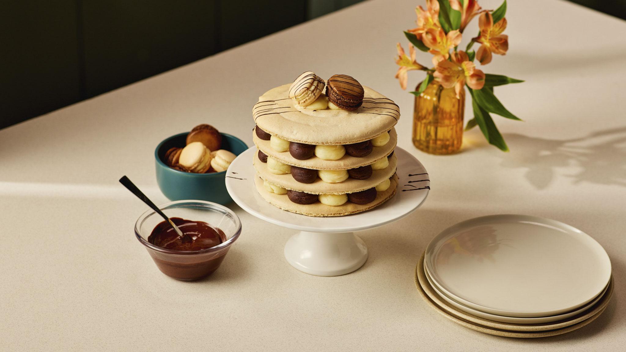 This stunning macaron cake is created by stacking 4 layers of large macarons, filled with smooth vanilla buttercream, and decorated with mini macarons. To save time, make the buttercream whilst the macarons are baking and cooling, then it’s ready to assemble and decorate! This recipe requires a food processor to blend the ground almonds and icing sugar as finely as possible. This helps achieve a smooth finish on the macarons. Macaron cake can be stored in the fridge for up to three days.