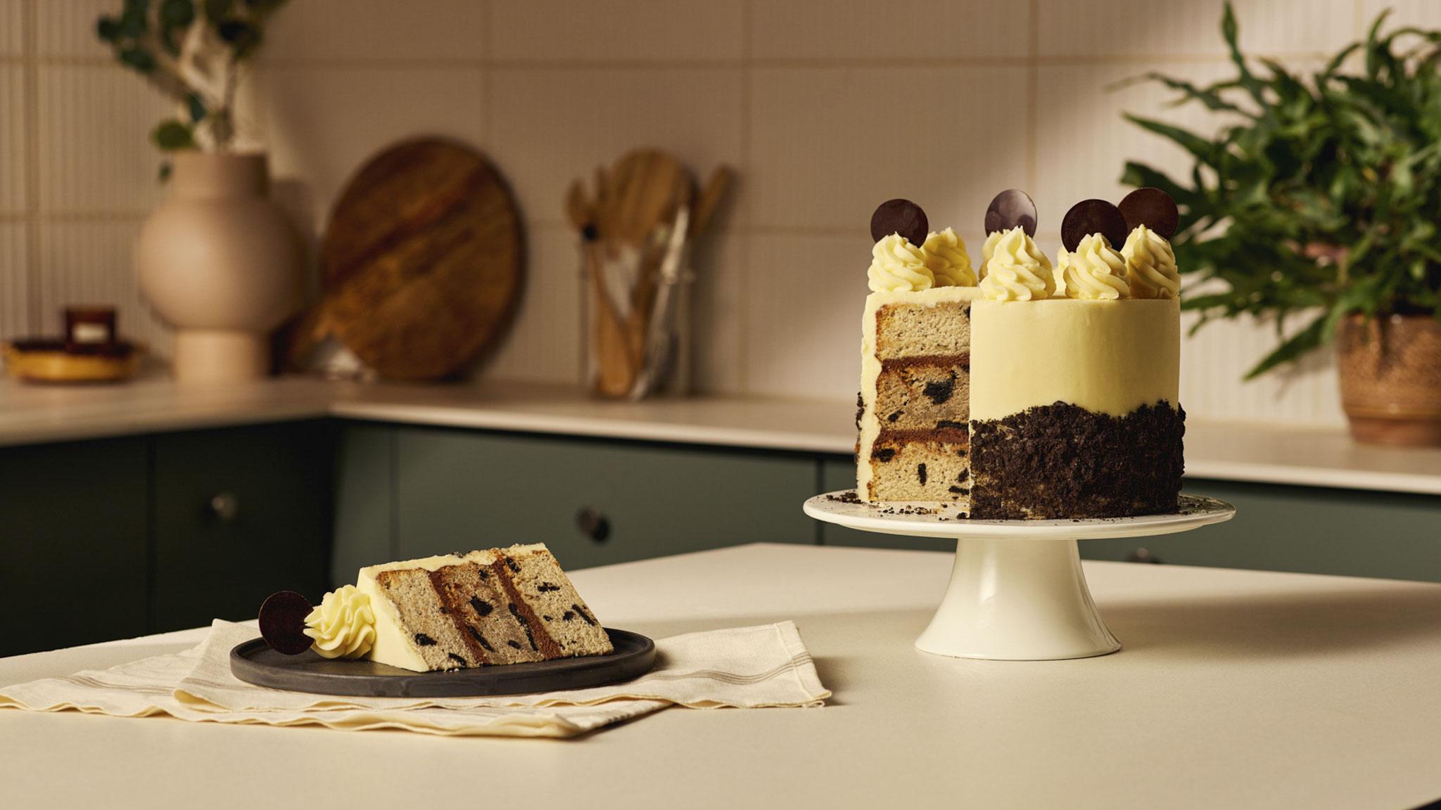 This delicious 3-layer cookies and cream cake is made with soft layers of vanilla sponge cake baked with pieces of chocolate sandwich cookies, filled with rich chocolate buttercream, and coated in smooth vanilla buttercream. Finished with a coating of cookie crumbs and cookies sprinkled over the top, this will surely impress your guests! To make your chocolate buttercream as dark as possible, we recommend using black cocoa powder.
