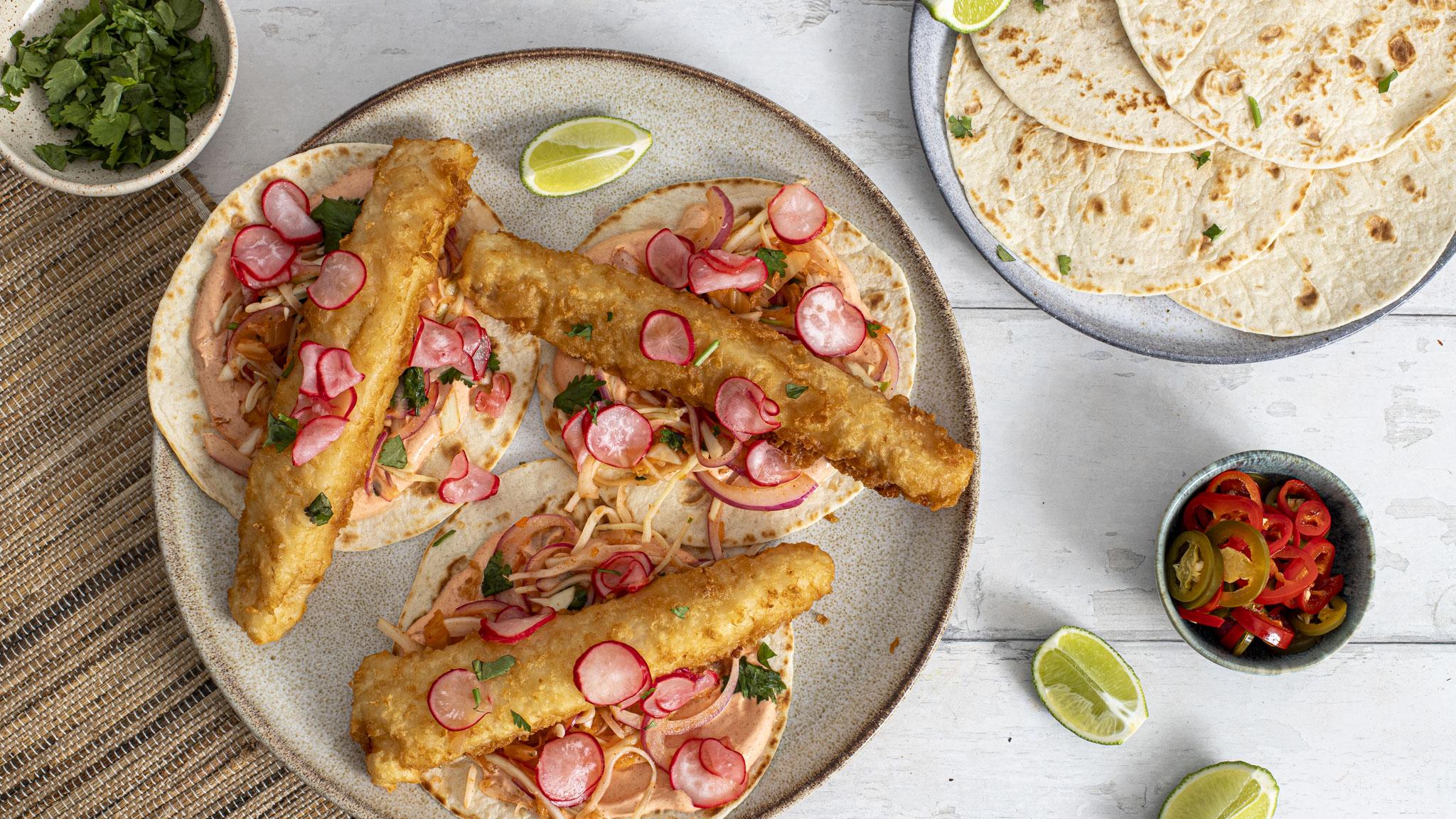 Crispy fried cod and a fresh kimchi slaw are encased in a warm, soft tortilla in this quick and simple recipe. Inspired by Baja fish tacos, quick-pickled radishes and a spicy gochujang crema make this dish one to cook over and over again.
