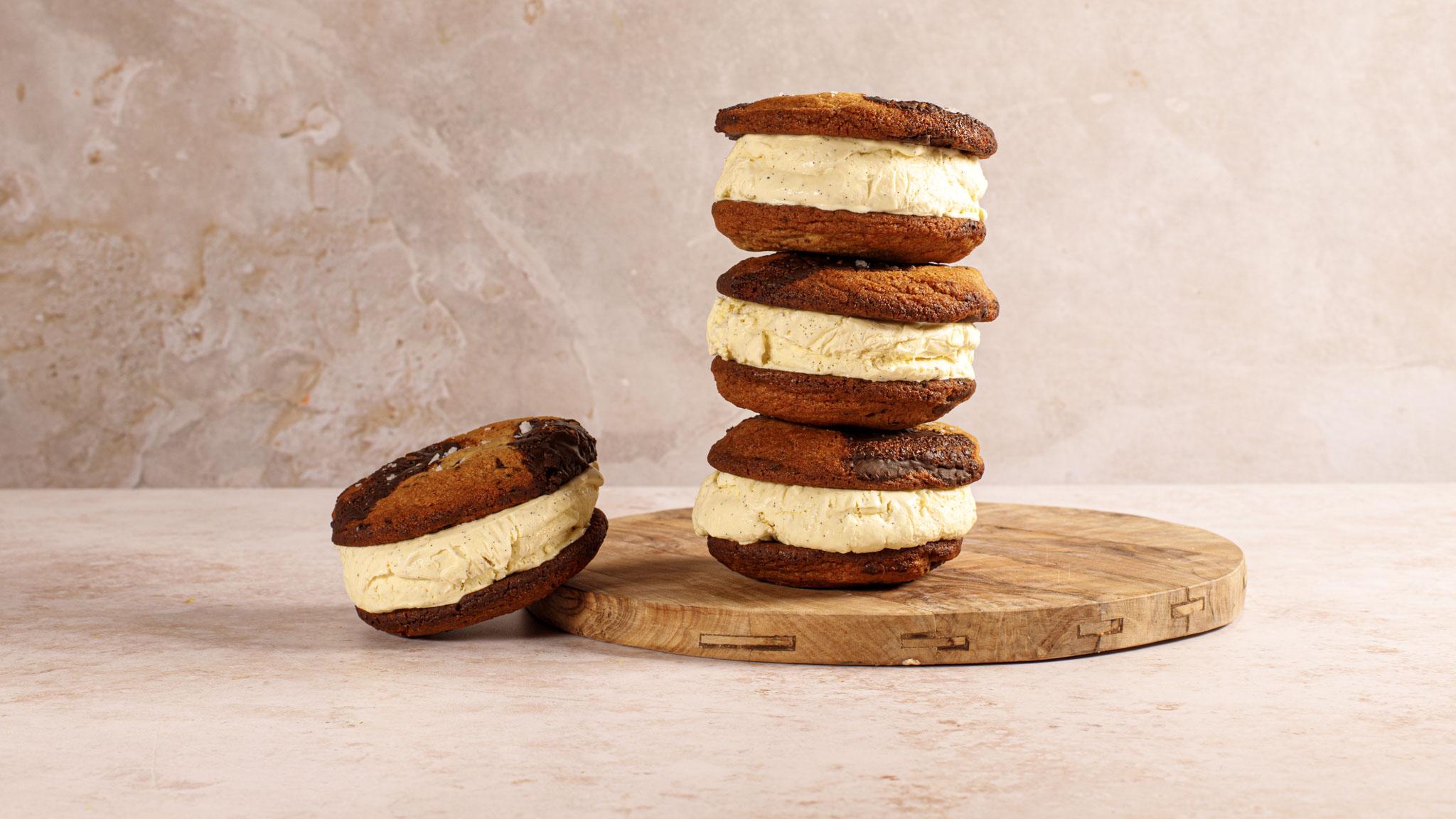 Creamy vanilla ice cream meets sweet-salty miso and nutty brown butter cookies in these rich, umami-packed ice cream sandwiches. Store in the freezer for up to 3 months. Remove from the freezer 15 mins before consuming to ensure the cookies defrost. Remember to place the freezer bowl in the freezer 24 hours in advance.