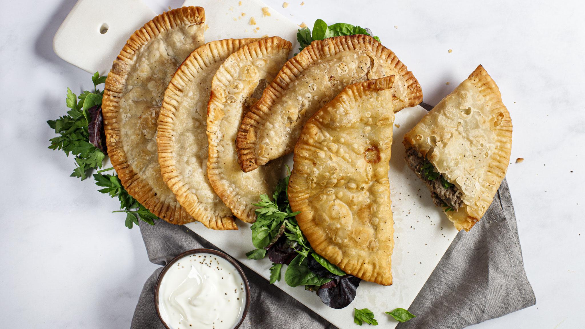 A fried street food snack, like a turnover or empanada, consisting of a crisp, bubbly crust filled with ground beef and onions, eaten widely throughout Central Asia, Russia, former Soviet Republics, Eastern Europe and Turkey.