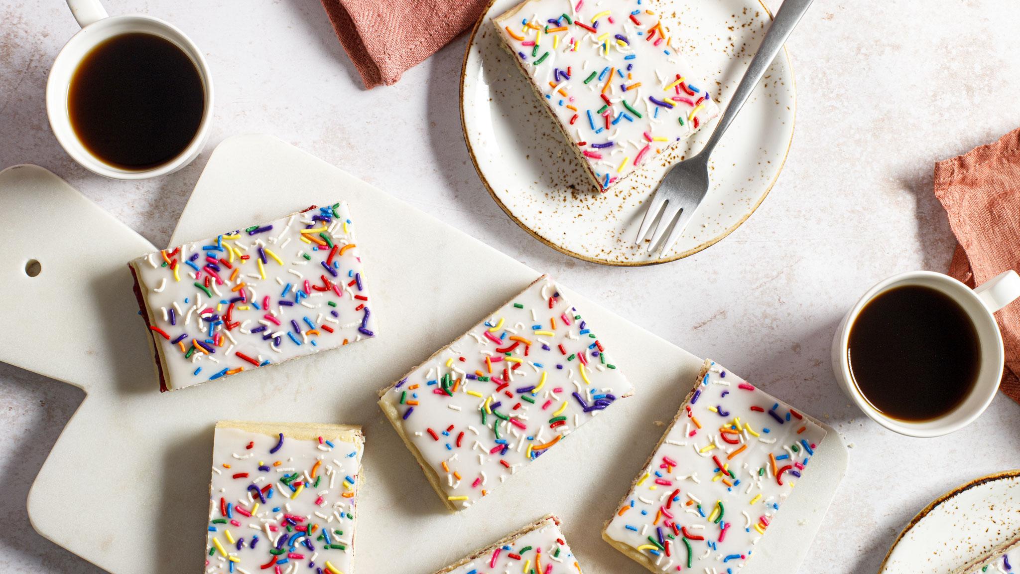 Hindbærsnitter are classic Danish pastry squares made from two layers of buttery shortcrust pastry filled with raspberry jam and topped with a sweet icing glaze. They can be decorated with colourful sprinkles or freeze-dried raspberries. Often enjoyed with coffee, they're a beloved treat in Danish bakeries.