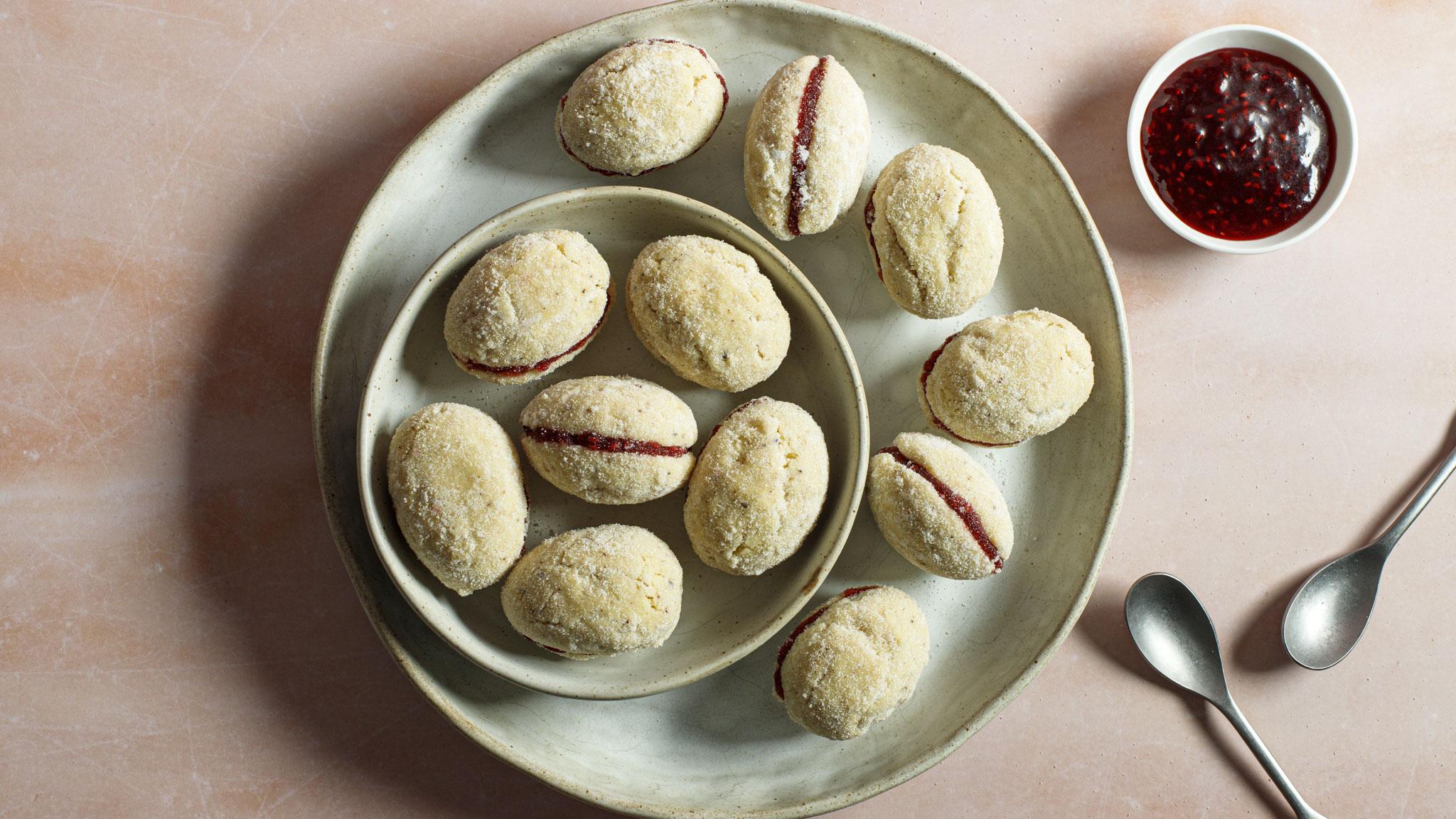 Lusikkaleivät, or "spoon cookies," are traditional Finnish shortbread-style biscuits made by browning the butter for that nutty flavour. They are made by pressing dough with a teaspoon to create their signature oval shape and then sandwiched together with a layer of raspberry jam and rolled in sugar to make a delicious treat!