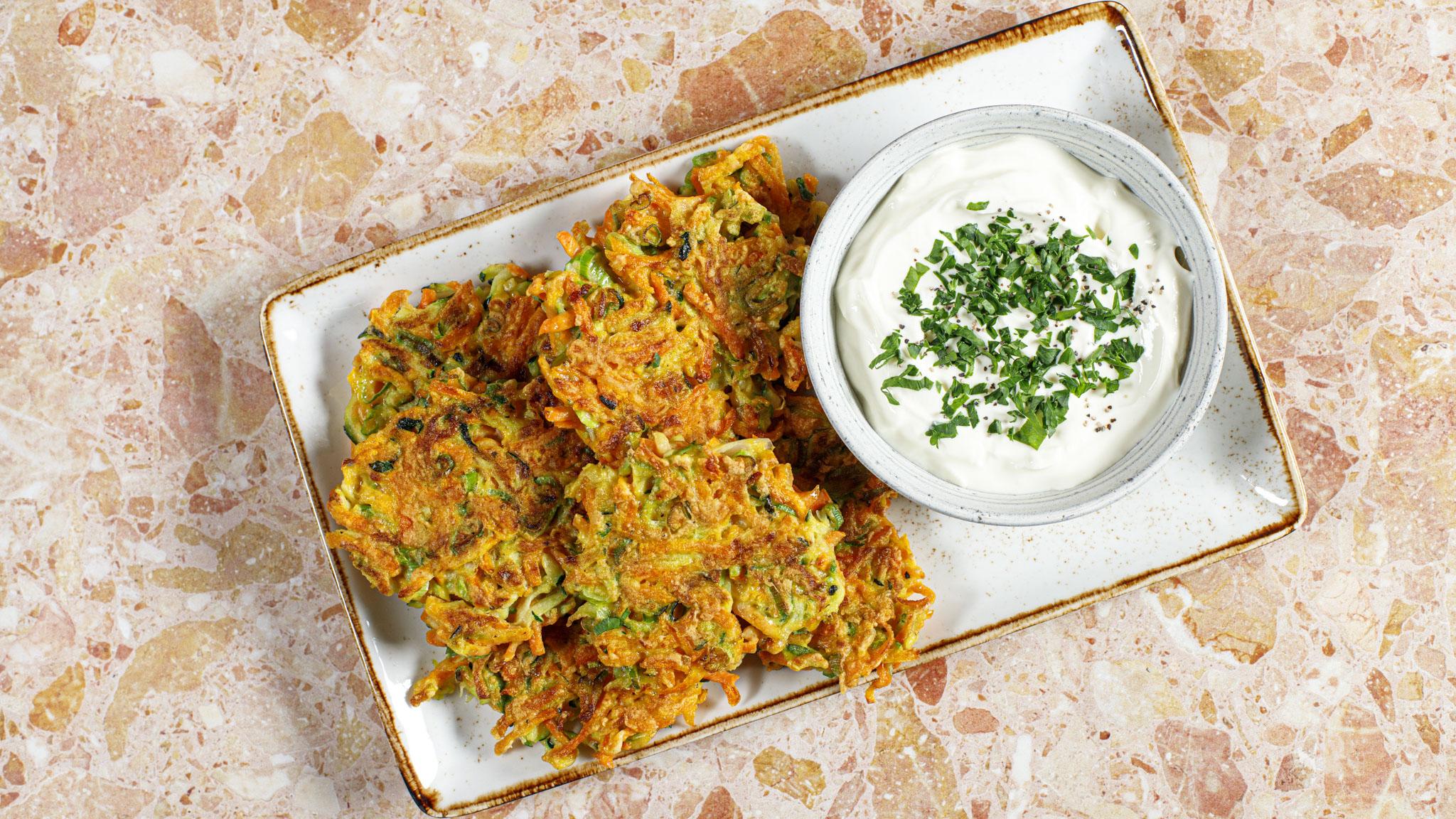 With a crispy exterior and tender inside, these savoury fritters are made with shredded courgette, carrots, spring onions, and garlic. They make a perfect light meal, snack, or tasty side dish, served with a healthy dollop of sour cream.