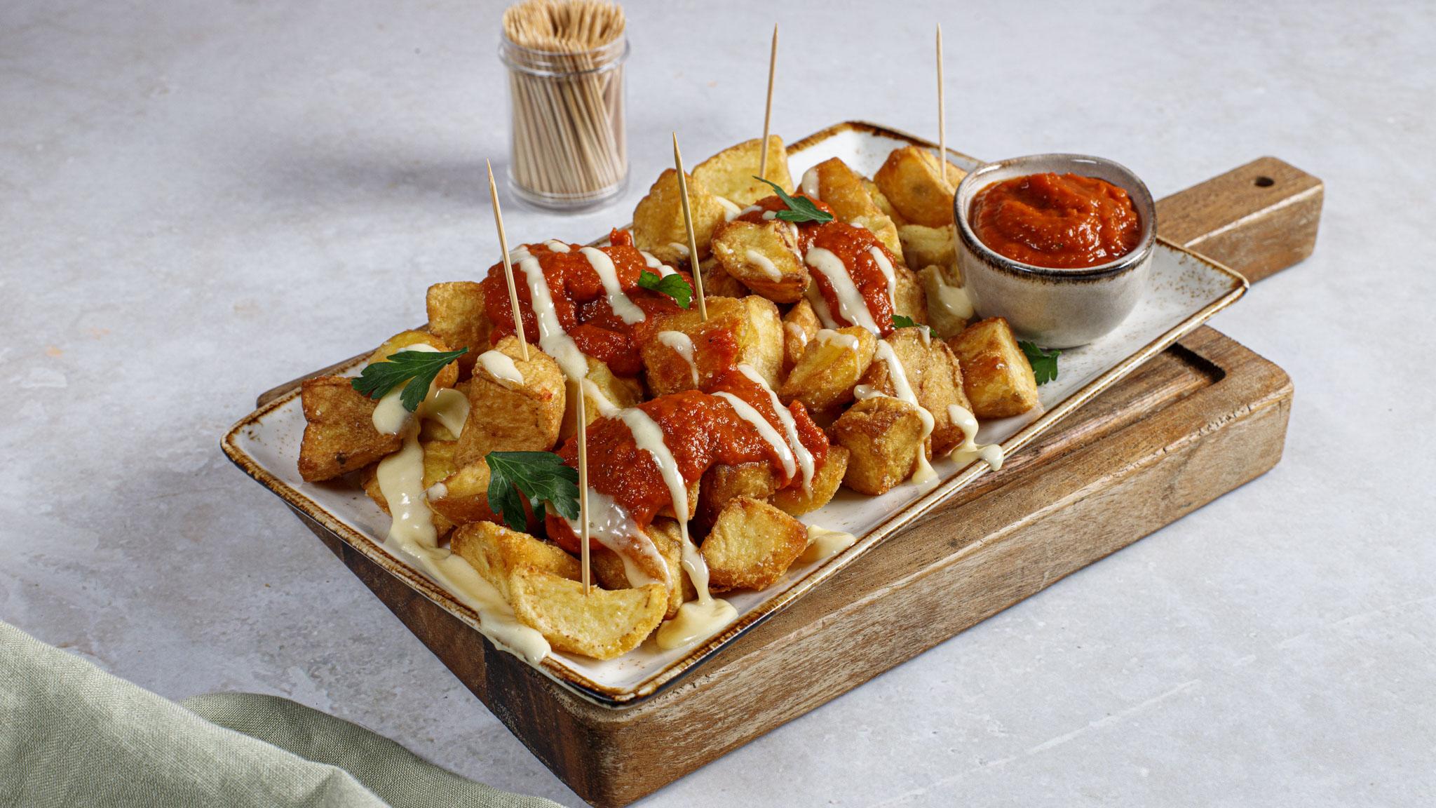 This recipe delivers the authentic patatas bravas experience: perfectly cooked potatoes - crispy outside, soft inside - drenched in a smoky and spicy tomato sauce. It’s an essential Spanish tapa, serving 8 people as part of a varied selection. For best results, use a very floury potato and allow the potatoes to cool completely, which helps to remove excess moisture.
