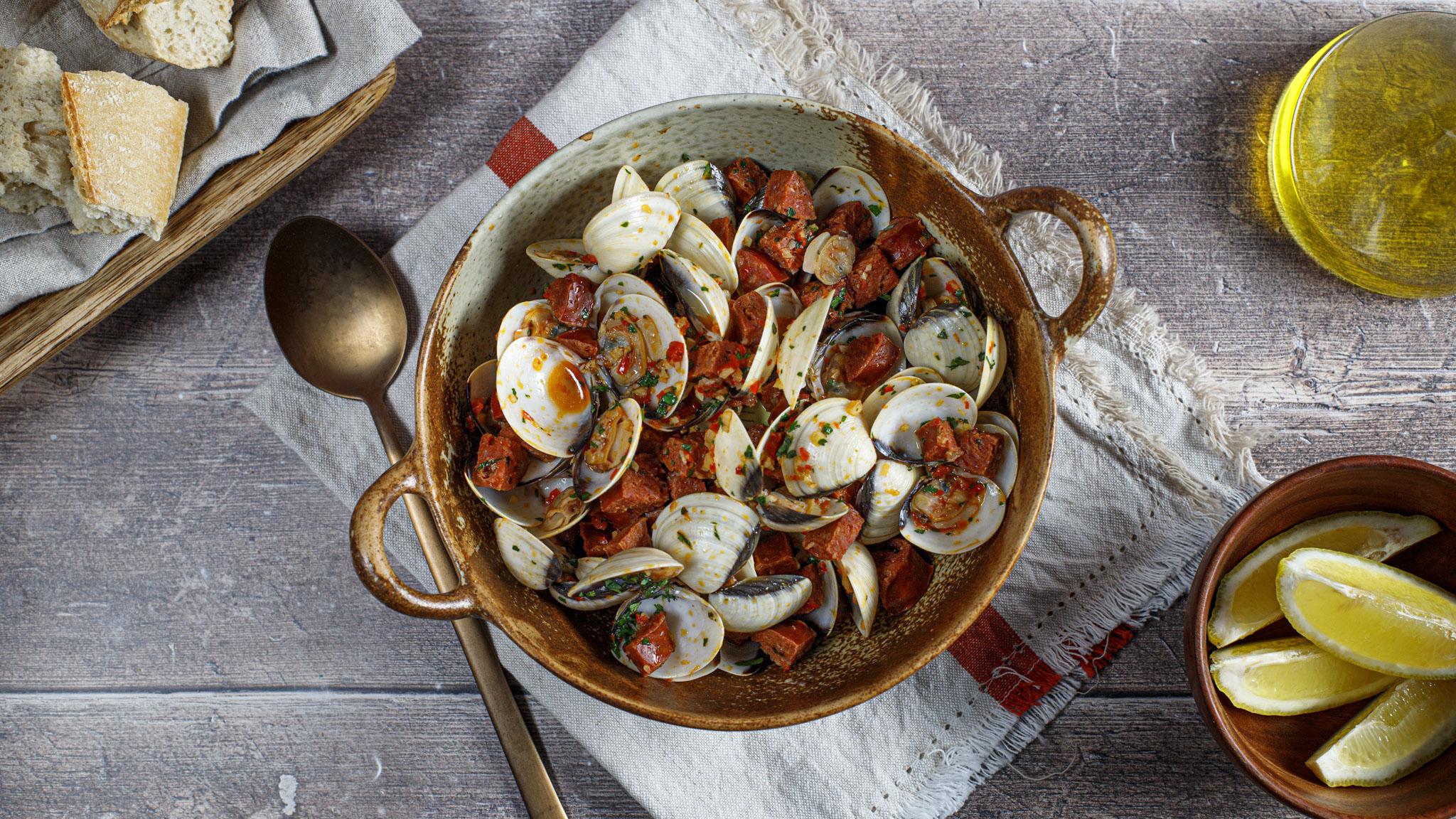 This classic Spanish-inspired seafood dish features fresh clams steamed open in a flavourful broth of white wine, spicy chilli, and smoky chorizo. The clams soak up the rich, slightly spicy sauce, perfect for dipping crusty bread. This recipe serves 4 as a light tapa or a starter.