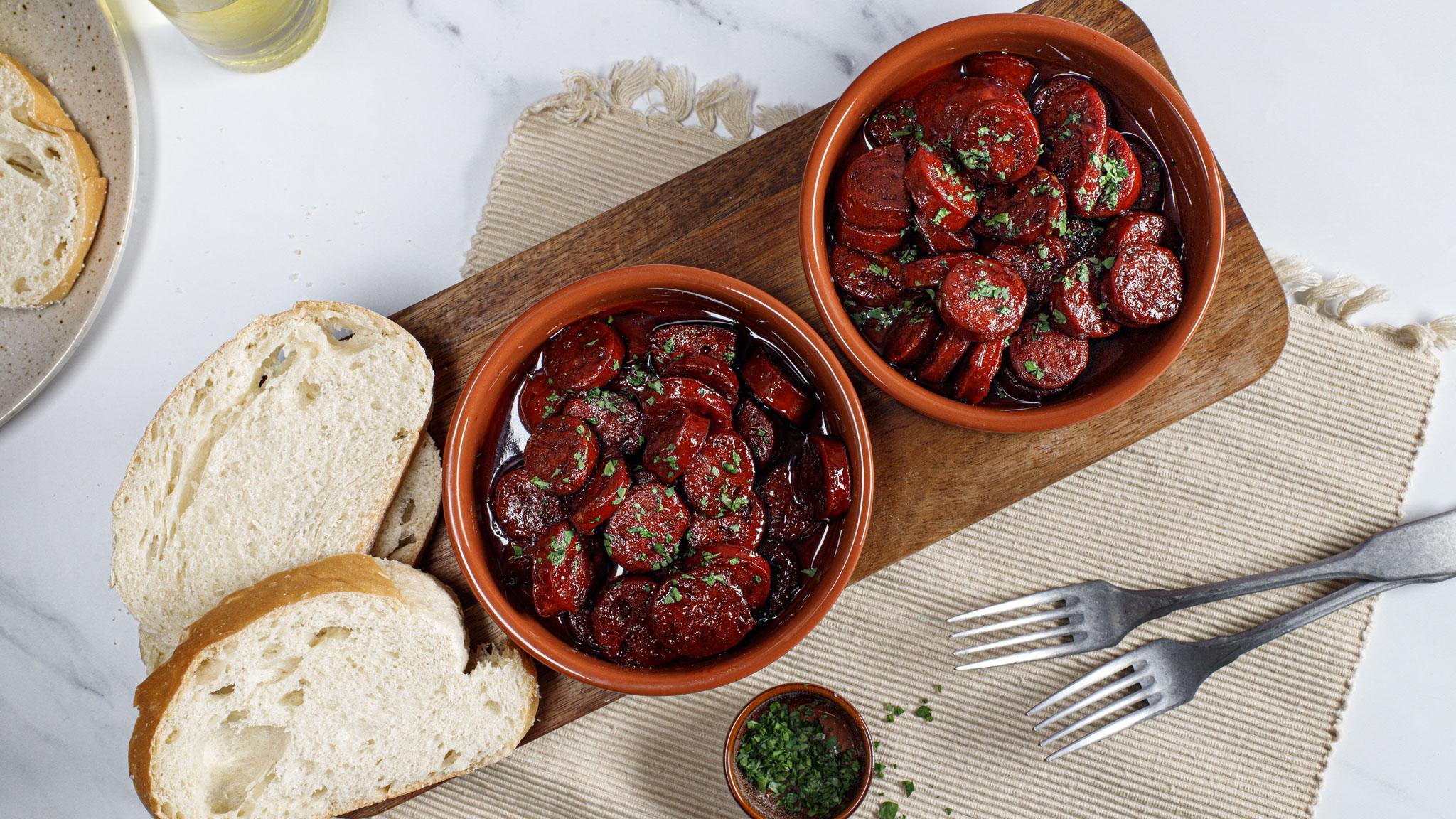 Chorizo al vino is a simple, yet incredibly flavourful Spanish tapa, where slices of spicy chorizo sausage are slowly simmered in red wine and honey until the sauce reduces to a sticky, savoury glaze. This recipe serves 8 as part of a tapas selection.