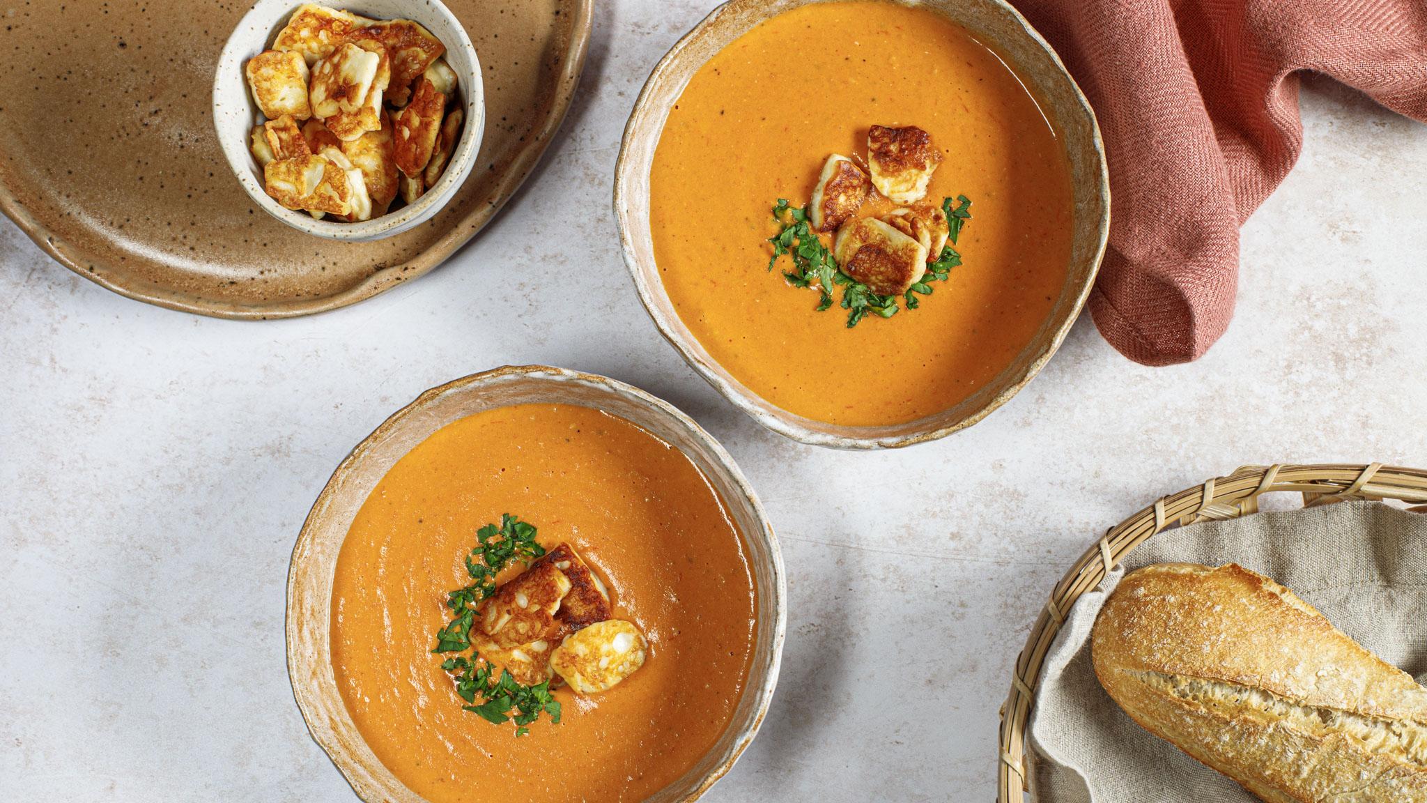 Roasting your tomatoes really helps to intensify their flavour, resulting in a rich, creamy soup that pairs perfectly with crisp, salty halloumi. Once cooled, store the soup in an airtight container in the fridge for up to 5 days, or freeze for up to 3 months.