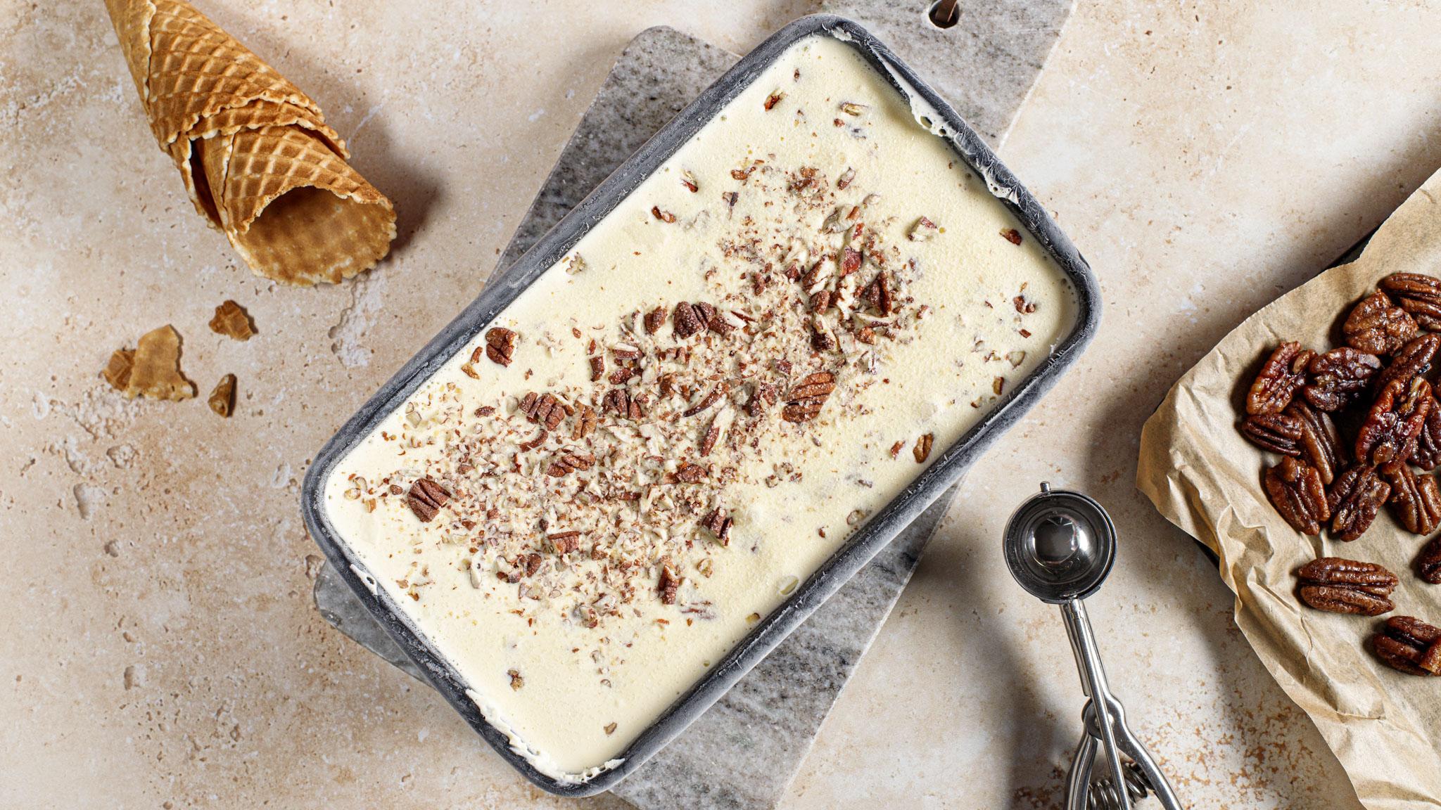 Classic American dessert flavours in an ice cream. Have on its own or make into an indulgent ice cream sundae. Remember to place the bowl in the freezer 24 hours in advance.