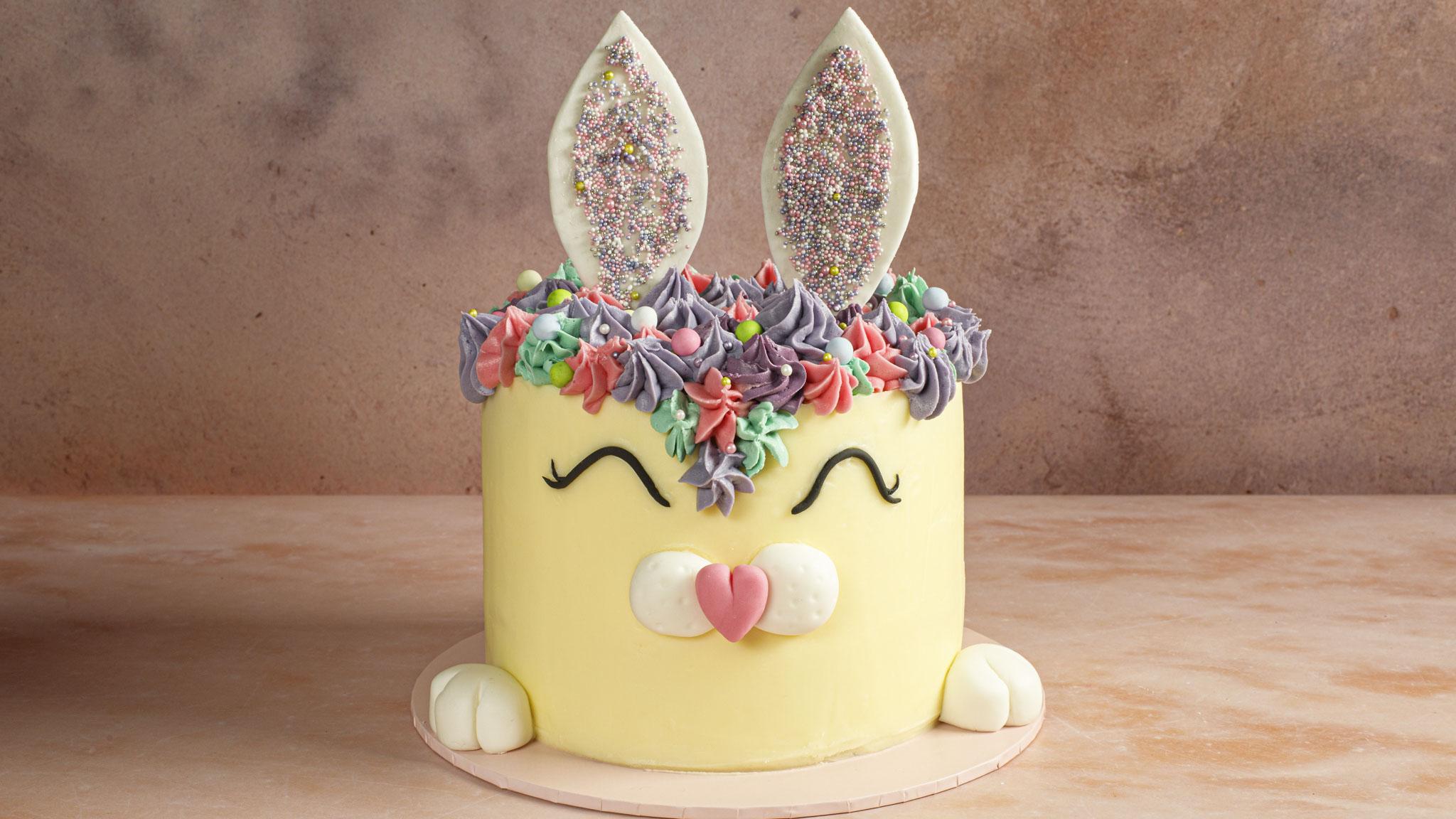 A colourful and cute lemon flavoured sponge cake, filled with lemon curd and buttercream, which will make everyone smile this, Easter. For this cake we recommend that you make the fondant bunny ears at least one day in advance, then allow them to dry out/firm up by placing them in a tray of cornflour- alternatively you could make these out of craft card instead. To colour the buttercream, we have used four different colours, alternatively you could use just one or two colours. We have used edible glue to stick the fondant features onto the cake, purchased from cake decorating suppliers, alternatively you could use a small amount of water or egg white. Use an 18 cm (7 inches) round tins, at least 3 cm deep.