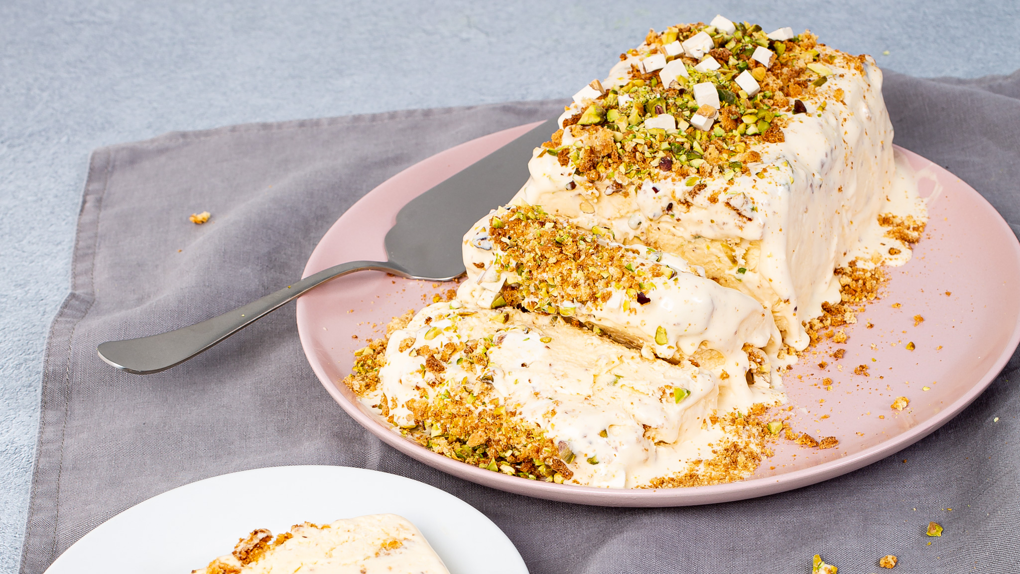 Semifreddo has a light creamy texture which doesn't completely freeze but melts in the mouth. Top with pistachios and amaretti crumbs to make it irresistible.