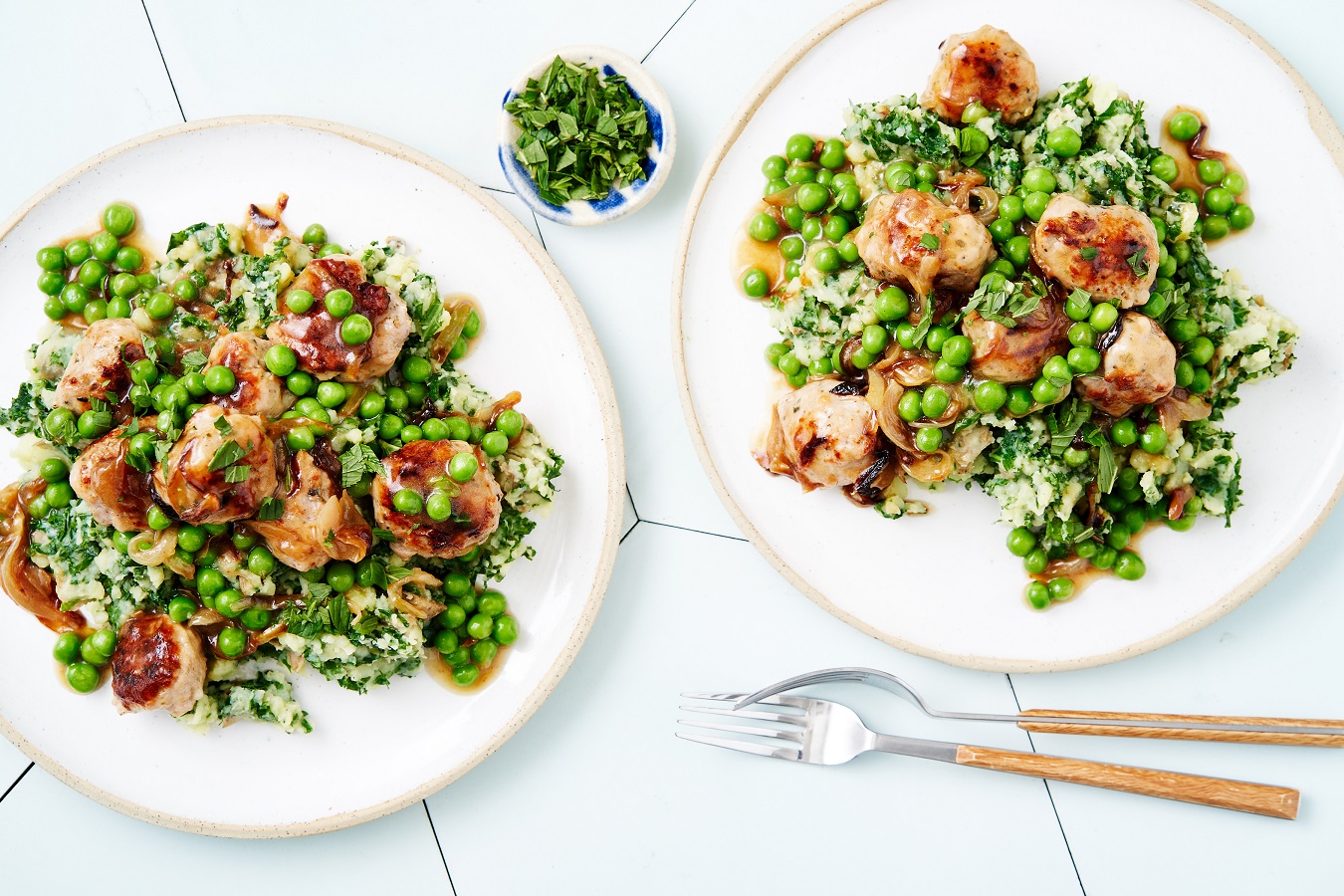 Pork meatballs in an onion gravy served on a bed of kale mashed potatoes. This recipe is produced by Marley Spoon, delivering fresh, pre-portioned ingredients directly to your door.