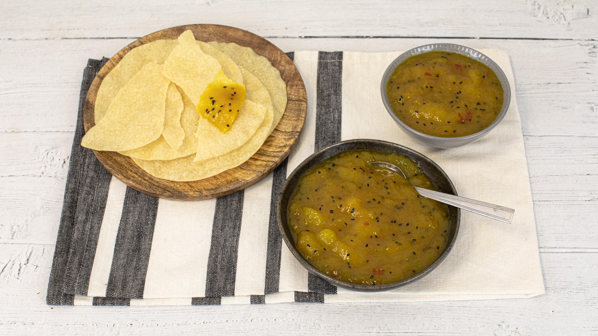 Un chutney de mangue à servir comme accompagnement de l’une de nos recettes de curry, avec des papadums et du pain naan. Il se conserve dans un bocal au réfrigérateur pendant plusieurs semaines.