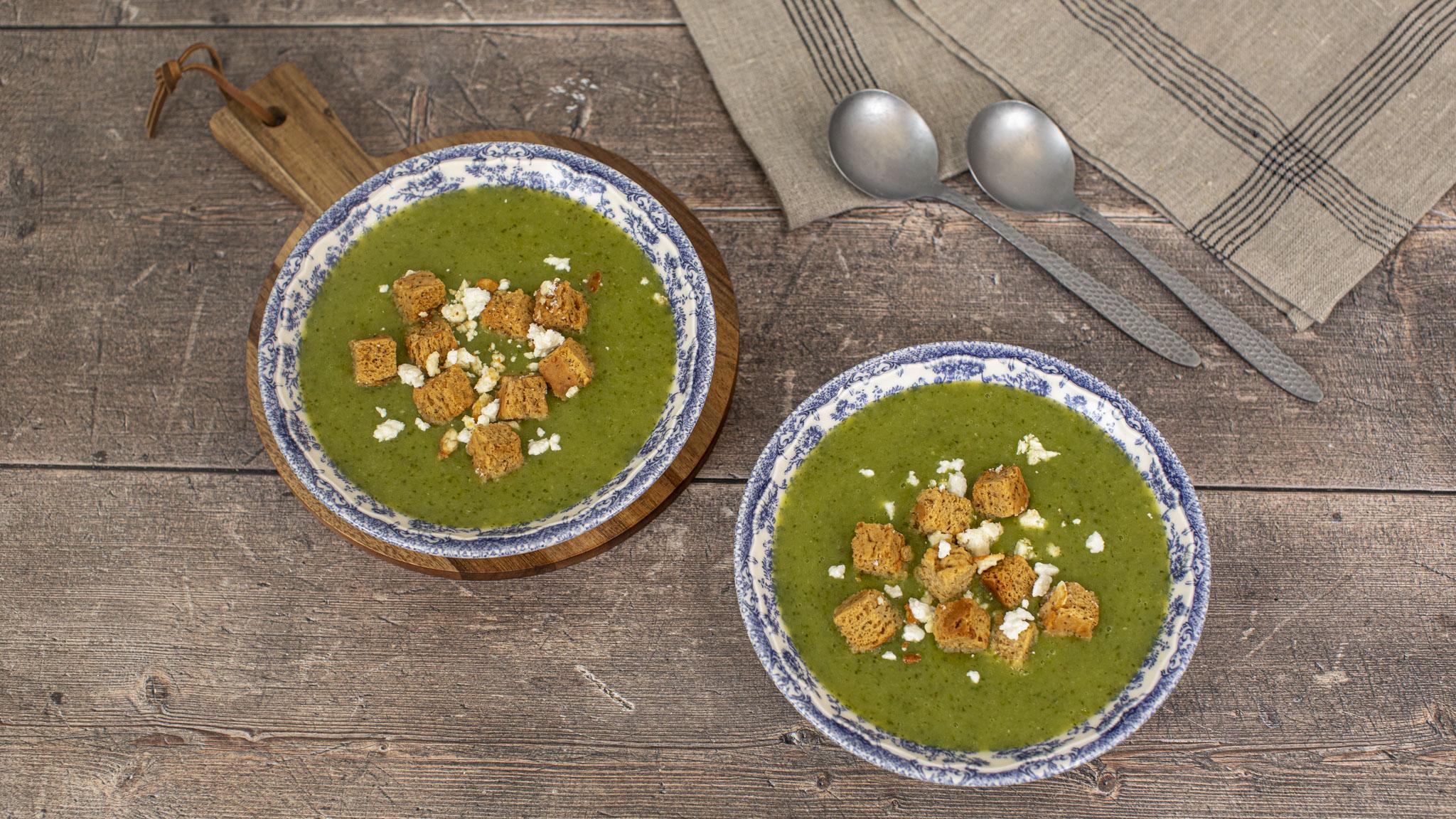 Cette soupe de courgette onctueuse est agrémentée de croûtons faits maison à la feta. Ces croûtons sont faciles à préparer et se conservent plusieurs jours au réfrigérateur.