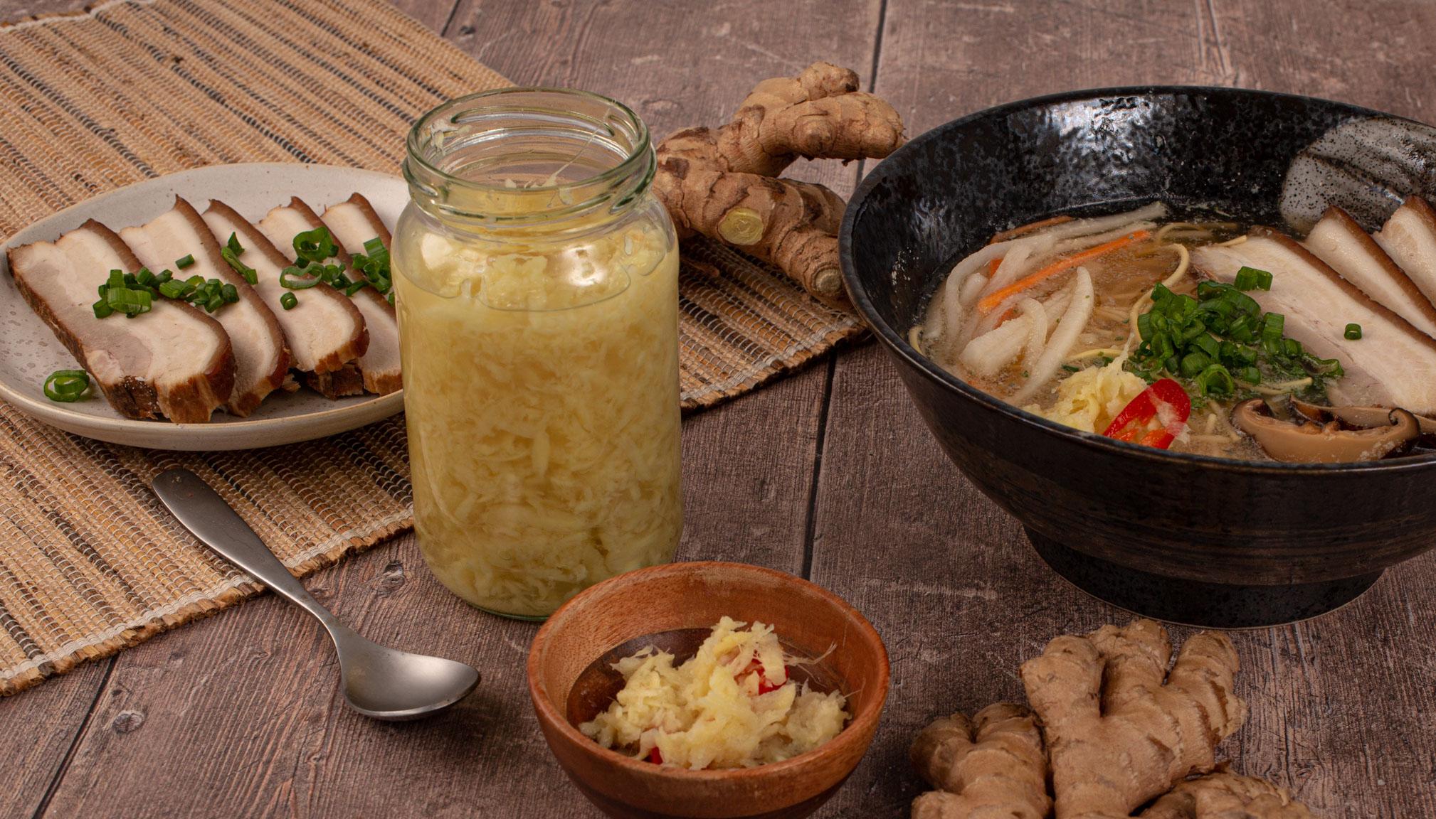 Vous connaissez peut-être le gingembre mariné rose vif que l'on utilise souvent pour garnir les bols de ramen occidentaux. Au Japon, ce type de gingembre était traditionnellement préparé avec les restes de saumure utilisée pour mariner des prunes, appelées umeboshi. Aujourd'hui, le gingembre mariné est généralement coloré avec des colorants alimentaires pour obtenir cette couleur vibrante. Dans notre version, il n'y a pas de colorant, mais ce qui manque en couleur est compensé par une acidité vive et un gout très prononcé. Le gingembre mariné est une garniture incontroubable des ramen. Essayez-le également avec du poisson gras et de la viande rouge ! Cette recette vous donnera un bocal de 400 ml. Assurez-vous que votre bocal est stérilisé en le passant au lave-vaisselle ou en le rinçant à l'eau bouillante et en le séchant dans un four à chaleur très réduite. Lorsque vous ajoutez la saumure dans le bocal, veillez à ce que le gingembre soit complètement recouvert afin d'éviter tout développement indésirable de moisissures.